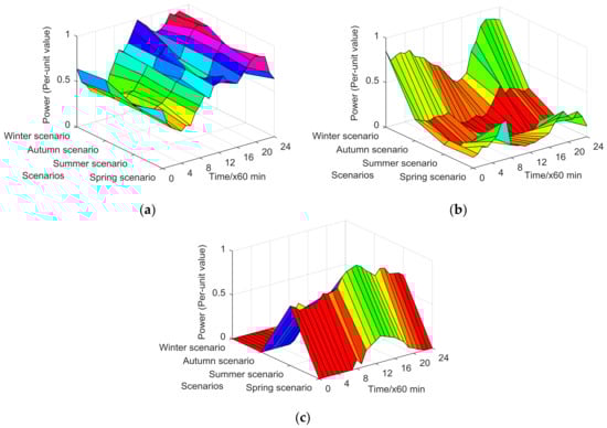 For the analysis of the electric/thermal/cold load characteristics in a typical new district, the differences among the electric/thermal/cold load characteristics of each functional district are considered (Section 2.1). For the thermal/cold load, the characteristics of the thermal load in the winter and the cold load in the summer are distinctive because of the existence of summer refrigeration equipment and winter heating equipment. Naturally, the thermal/cold loads are relatively lower in the spring and autumn due to the suitable weather conditions. For the electric load, due to the obvious differences in electric demand in different seasons, there is also a certain difference in its output characteristics. Therefore, there are obvious seasonal differences in the various load types. The typical timing characteristic curves of the electric/thermal/cold loads in different seasons in a typical new district are shown in Figure 2.
