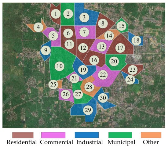 Taking a typical new district in Northern China as an example, the planned size of the new area is approximately 8.6 × 107 m2, and it includes eight residential districts, six commercial districts, seven industrial districts, five municipal districts, and four other functional districts (such as parks and greening sites). The functional type, spatial location and covered area of each functional district are given in Appendix A (Table A1). This district’s planning map is shown in Figure 4.