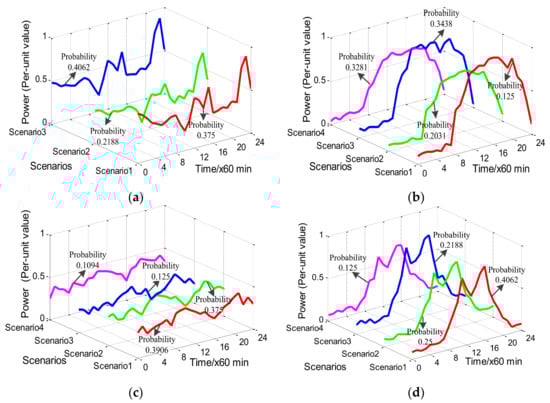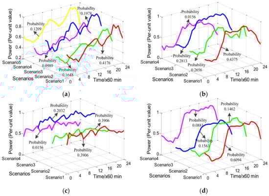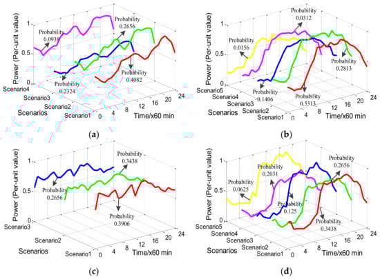 It can be seen from Figure 5, Figure 6, Figure 7 and Figure 8: based on the timing-phasing and hybrid clustering method, the multi-scenarios of the electric/thermal/cold load fluctuatuon can be obtained. For each typical timing characteristic curve of the electric/thermal/cold load fluctuation, its amplitude of variation are different, which represent several discrete scenarios, and its probabilities are also distinct, which indicate the likelihood of each scenario occurring. Therefore, the obtained multi-scenario curves have a larger coverage area and also can enhance its volatility when compared with the single typical daily curve simulation. Thus, the uncertainty of the electric/thermal/cold load fluctuation can be further characterized.