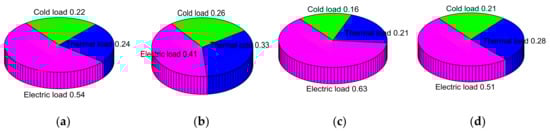 The weight values of the electric/thermal/cold loads in various typical functional districts. (a) Residential district; (b) commercial district; (c) industrial district; (d) municipal district.