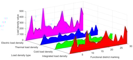 In Figure 10, the colour planes represent the load densities of the different energy utilization types for all of the functional districts. The electric load density of each functional district is larger, but the thermal and cold loads are relatively small, and the difference between them is slight. For the functional districts with the same type of energy utilization, the difference in the load density values of each functional district is obvious. For functional districts 3, 9, 18, 19, 24, 29 and 30, the load density values are significantly larger and the functional district type belongs to the industrial category; the load densities of municipal districts 2, 10, 20 and 27, commercial districts 5, 7, and 13 and residential districts 6, 11, 12, and 17 are relatively small, and the variation in the ranges of the load density of the commercial district, residential district and municipal district is very similar. The variation in range of the load density of the municipal districts is slightly higher than the corresponding variation in range for the residential districts, and the residential districts’ variation range is slightly higher than the commercial districts’ variation range. However, the load densities of functional districts 4, 14, 25 and 28 are the smallest, and their functional district types are parks, greening belts, squares and other areas with less obvious energy utilization characteristics. In addition, for functional districts with the same energy utilization type, due to the differences in geographical position, population density, economic level and energy utilization habits, the load densities of different functional districts may be different.