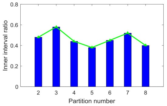 - Calculate the inner interval ratio in each partition result according to Equation (13). Then, compare the inner interval ratio’s value, and obtain the optimal partition results of the typical new district.