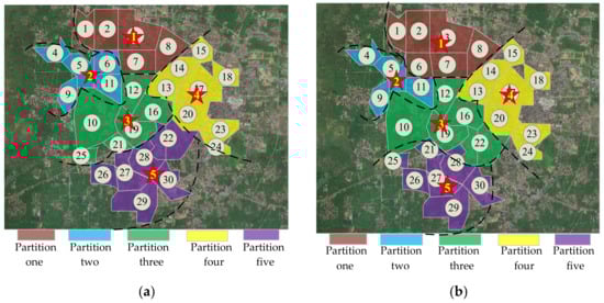 The partition situation of the typical new district under different planning methods. (a) Planning method in this paper; (b) Adaptive robust optimization method.
