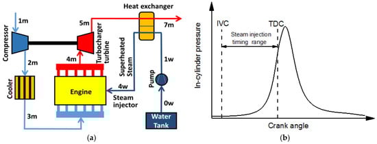 (a) Schematic of the turbocharged diesel engine with in-cylinder steam injection; (b) steam injection timing range.