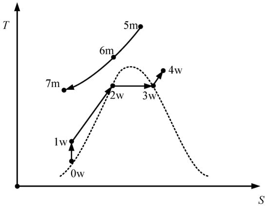 It can be seen from Equation (23) that the heat transfer capacity of the heat exchanger is large when the water is heated into superheated steam. Therefore, to ensure the heat transfer capacity of the heat exchanger, pinch point analysis is adopted. The pinch point is the location where the minimum temperature difference between cooling and heating sides in the heat exchanger exists. For a given heat flux, a larger minimum temperature difference requires a smaller heat transfer area. Thus, the mass and volume of the heat exchanger can be smaller and the cost will be lower. In this study, the minimum temperature difference is set at 20 °C (or 20 K) to ensure the driving force of heat transfer. The pinch point may occur at the point 1w, 2w, or 4w, as shown in Figure 1a. The minimum temperature difference can be expressed as Equation (24):