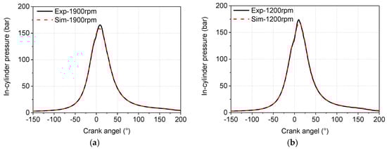 Comparison of in-cylinder pressure profiles at 1900 rpm and 1200 rpm under full load conditions: (a) 1900 rpm; (b) 1200 rpm.