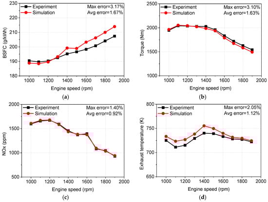 Validation of the turbocharged diesel engine simulation model: (a) brake-specific fuel consumption (BSFC); (b) torque; (c) NOx emissions; (d) exhaust temperature (at the turbine outlet).