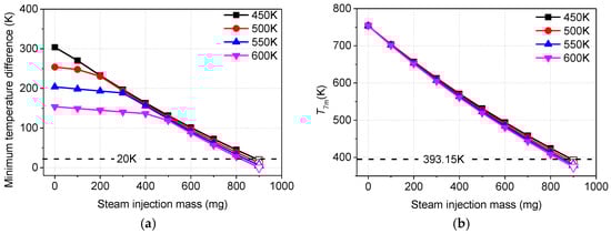 Impact of steam injection mass and temperature on and at engine speed 1900 rpm (steam injection timing = −90°, steam injection pressure = 8 bar). (a) Minimum temperature difference ; (b) exhaust temperature at heat exchange outlet .