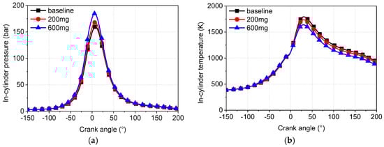 The influence of steam injection mass on in-cylinder pressure and temperature at engine speed 1900 rpm (steam injection timing = −90°, steam injection pressure = 8 bar, steam injection temperature = 500 K). (a) In-cylinder pressure; (b) in-cylinder temperature.