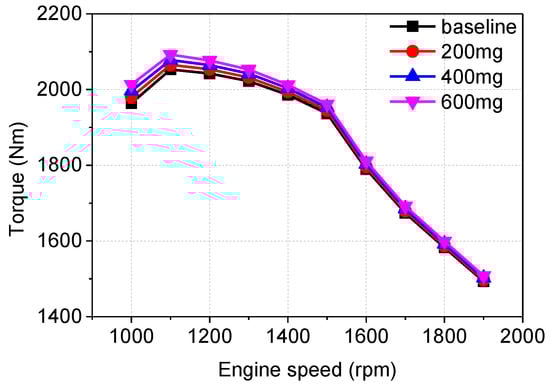 The influence of steam injection mass on engine torque under full load at engine speeds from 1000 rpm to 1900 rpm is shown in Figure 7. Since the peak in-cylinder pressure increases with steam injection, the piston work during the power stroke increases. As a result, engine power improves. Therefore, engine torque also increases. As shown in Figure 7, engine torque increases as the steam injection mass increases. Besides, engine torque improves more significantly at low/medium engine speed. Compared with the baseline engine, engine torque increases by 1.0–2.5% at different engine speeds when the steam injection mass is 600 mg per cylinder per cycle. The largest increase of engine torque is 2.5%, which occurs at 1000 rpm with 600 mg per cylinder per cycle.