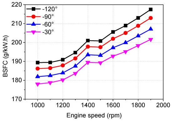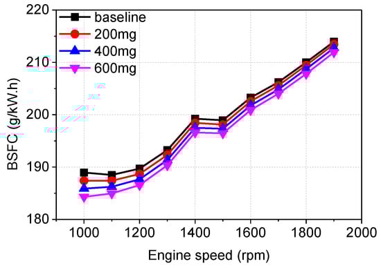 Figure 8 illustrates the effects of steam injection mass on BSFC with respect to engine speed under full load condition. Because of the increased engine power, BSFC decreases with steam injection. It can be seen from Figure 8 that more steam injection mass results in a greater reduction of BSFC. Also, BSFC improves more remarkably at low/medium engine speed. BSFC is reduced by 1.0–2.5% at different engine speeds compared with the baseline when the steam injection mass is 600 mg per cylinder per cycle.