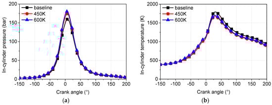 The effects of steam injection temperature on in-cylinder pressure and temperature under full load at 1900 rpm are shown in Figure 10. The results were obtained in the situation of steam injection mass of 400 mg per cylinder per cycle, steam injection timing of −90°, and steam injection pressure of 8 bar. It can be seen that steam injection temperature has relatively little impact on in-cylinder pressure and temperature. This is because the enthalpy of the steam increases only slightly as the steam injection temperature increases from 450 K to 600 K. Therefore, in-cylinder pressure and temperature increase weakly as steam injection temperature increases. The maximum in-cylinder pressure and temperature increase by 3.4% and 1.5%, respectively, when the steam injection temperature increases from 450 K to 600 K.