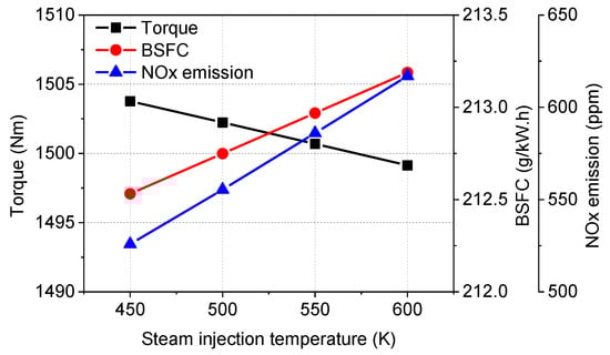 The impact of steam injection temperature on engine torque, BSFC, and NOx emissions under full load at 1900 rpm is shown in Figure 11. It can be seen that engine torque is slightly reduced and BSFC is slightly increased as steam injection temperature increases. This is because the steam injection temperature has only a little impact on in-cylinder pressure. Although the increased maximum in-cylinder pressure benefits the improvement in engine power, the negative compression work is also increased. Therefore, the engine power is slightly reduced as the steam injection temperature increases. The reduction of engine torque and the increase of BSFC are both within 0.4% when the steam injection temperature increases from 450 K to 600 K. As for NOx emission, it is sensitive to the change of in-cylinder temperature. Therefore, the impact of steam injection temperature on NOx emission is remarkable. The in-cylinder temperature increases as steam injection temperature increases, which favors the generation of NOx emissions. When the steam injection temperature increases from 450 K to 600 K, NOx emissions increase by 17.3%.