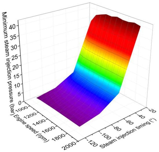 Minimum steam injection pressure with different steam injection timings at various engine speeds.