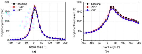 The influence of steam injection timing on in-cylinder pressure and temperature at engine speed 1900 rpm (steam injection mass = 400 mg, steam injection pressure = 50 bar, steam injection temperature = 550 K). (a) In-cylinder pressure; (b) in-cylinder temperature.