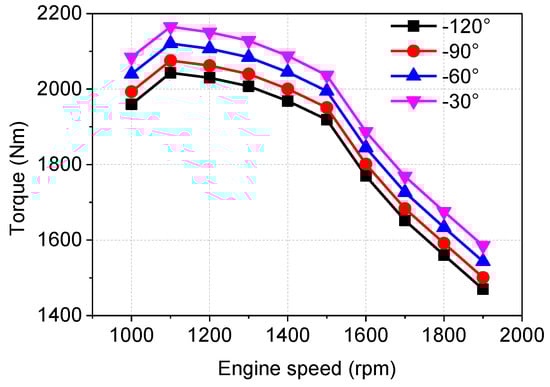 The negative compression work is reduced as the steam injection timing slows down, which benefits the increase of engine power. Figure 14 illustrates the effects of steam injection timing on engine torque under full load at engine speeds from 1000 rpm to 1900 rpm. It can be seen that engine torque increases as the steam injection timing slows down. Engine torque increases by 5.9–7.8% at different engine speeds as the steam injection timing slows down from −120° to −30°.