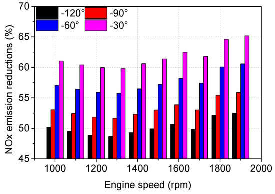 According to the generation mechanism of NOx emission described by the extended Zeldovich model, NOx emission is mainly affected by the peak in-cylinder temperature and the O2 concentration in the cylinder. The impact of steam injection mass on the reduction of NOx emissions under full load at various engine speeds is given in Figure 9. Since the peak in-cylinder temperature and the O2 concentration both decrease, NOx emission is sharply reduced by steam injection. When steam injection mass is 600 mg per cylinder per cycle, NOx emissions are reduced by 70.7–76.2% across all engine speeds. In addition, with larger steam injection mass, the NOx emission is further reduced. When steam injection mass increases from 200 mg per cylinder per cycle to 600 mg per cylinder per cycle, NOx emissions are further reduced by 59.8%.