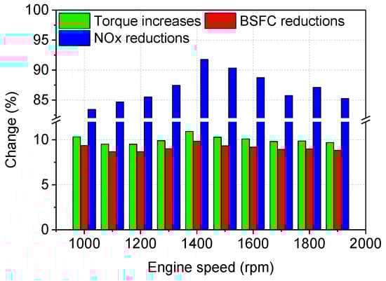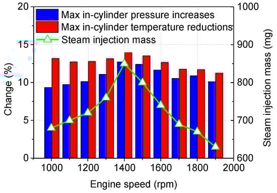 The largest improvements of engine torque and BSFC and maximum reductions of NOx emissions with optimal steam injection mass at different engine speeds (steam injection timing = −30°, steam injection temperature = 550 K, steam injection pressure = 50 bar).