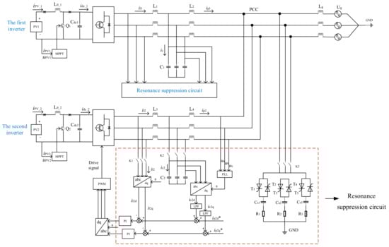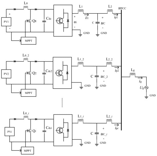 The photovoltaic cluster inverter system is composed of a number of photovoltaic grid-connected systems connected in parallel, and the output current of multiple inverters will flow into the power grid after the convergence of Point of Common Coupling (PCC) [,,]. The principle of the photovoltaic inverter cluster system is shown in Figure 1.