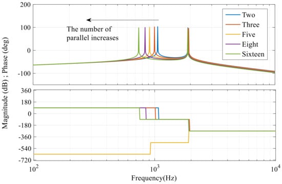 Figure 4 shows that as the number of parallel inverters increases, the resonance frequency decreases. The reason is that after multiple inverters connected in parallel, the current flowing through the equivalent impedance of the grid is doubled, which is equivalent to doubling the impedance of the grid in each inverter equivalent circuit, so that the resonance frequency of the grid is reduced.