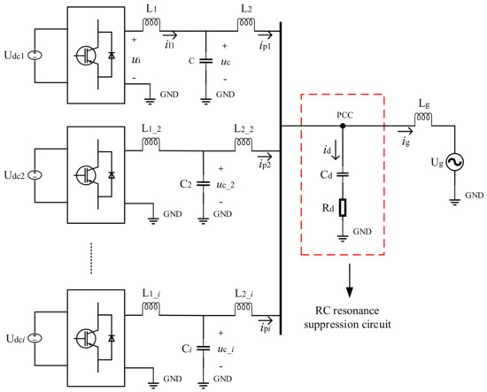 Therefore, RC-type global resonance suppression method is adopted in this paper to eliminate the resonance generated by grid-connected inverter cluster. In this method, the RC circuit is paralleled at the PCC. The function of the resistor is to increase the system damping, reduce the resonance peak caused by the grid current harmonics, and the role of the capacitance is to make the damping resistor only act at the frequency of the resonance point, which reduces the system loss in power frequency. The principle of the RC resonance suppression circuit is shown in Figure 7.