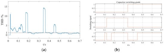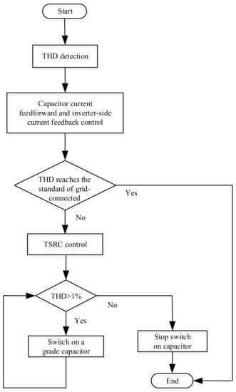 Total Harmonic Distortion (THD) can intuitively reflect the resonance degree of the system, so the THD control strategy is adopted to determine the number of switched capacitor grades, the THD control flow chart is shown in Figure 11. Start, the system performs THD detection, the resonance suppression of a single inverter is performed first after the resonance is detected. Then judged whether THD reaches the standard of grid-connected, if it does not, start the TSRC control strategy. The THD standard is set as 1%, the capacitor groups switch into the grid grade by grade, and be tested each time until THD ≤1%, it means that the resonance of the system has been suppressed. At this time, the capacitor switching is stopped.