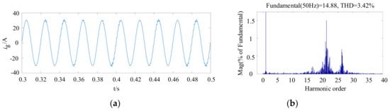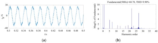 As can be seen from Figure 13, the current waveform is distorted and the grid-connected current generates resonance. The total harmonic distortion reaches 9.9%, of which the 22nd and 27th harmonic content are very high, which are inverter cluster grid-connected resonance and LCL inverter self resonance.