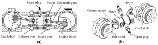 The opposed-piston two-stroke engine (OP2S) concept can be traced to the late 19th century in Europe, and subsequently developed in multiple countries for a wide variety of applications including aircraft, marine vehicles, and land vehicles [1,2,3]. Compared with conventional engines, opposed-piston two-stroke engines have some advantages, such as high power density, low heat transfer loss and mean piston velocity, and well balanced performance. However, the emission performance is worse because of the high machine oil consumption. In the recent years, with the advance in design technology, modern analytical tools, materials, and engineering methods, the emission problem is no longer limiting the successful design of a clean and efficient OP2S [4].