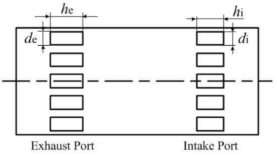 As shown in Figure 2, the scavenging system parameters include intake port height stroke ratio (hi), exhaust port height stroke ratio (he), intake port width (di) and exhaust port width (de). The port height stroke ratio (α) is defined as the ratio of port height stroke ratio and stroke length and the circumference ratio (β) is defined as the ratio of port width and cylinder circumferential length [21,22,23].