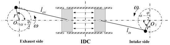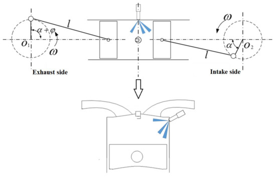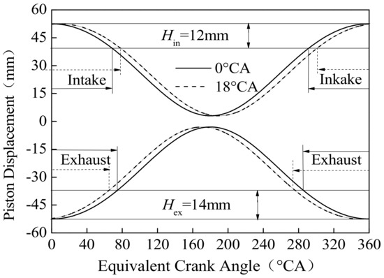 As shown in Figure 3, the opposed-piston motion phase difference (φ) is between the intake piston and exhaust piston motion phase difference. The port timing is asymmetric, in which the exhaust ports opening earlier than the intake ports; the exhaust ports also close earlier than the intake ports. Because of the φ, opposed pistons cannot arrive at each top dead center (TDC) simultaneously [20].