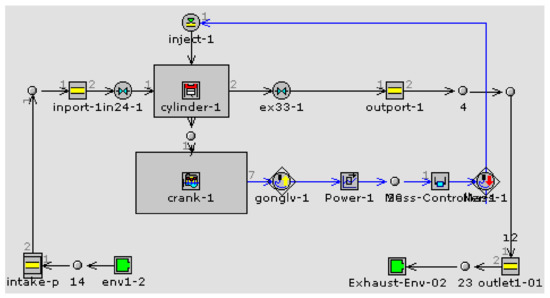 1D scavenging process is simulated by GT-Power. It is widely used in engine design because of its flexibility [24,25]. The detailed model is shown in Figure 5. In the GT-Power model, the “Eng Cyl Comb SI Turb” quasi-dimensional model and Woschni model were employed to describe combustion and heat transfer respectively [26]. This software solves 1D time dependent equations predicting the mass flux in intake and exhaust systems; a 0D approach is used to calculate the combustion development, in-cylinder pressure, the thermal exchanges, and the indicated work into the cylinders. Pressure losses, due to three-dimensional effects in particular zones of the engine, such as intake ports and exhaust ports, were considered through appropriate discharge coefficients, defined as the ratio between effective and geometric flow areas.