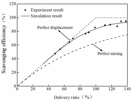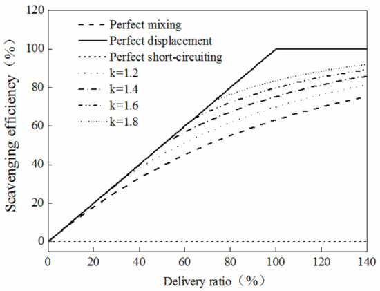 For different k, the relationship between scavenging efficiency and delivery ratio was different, as shown in Figure 6. With the increase of k, the scavenging process was close to the perfect displacement model. When k was 1, the scavenging process was the perfect mixing model.