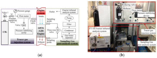 The tracer gas method was selected as the simplest method to measure the scavenging performance of the OP2S-GDI engine. As described in reference [2], the engine may be idealized as a steady-flow system. This method is based on the use of small quantities of a gas which are assumed to burn completely at combustion temperature but not to burn at temperatures below those prevailing in the cylinder when the exhaust ports open. Figure 7a presents the test schematic of scavenging efficiency using tracer gas method. It consists of three parts: tracer gas injection system, sampling, and analysis system and OP2S-GDI engine. As shown in Figure 7b, tracer gas methane is injected into the intake manifold for homogeneous mixing. The experiment utilizes reducing valve, flow-meter and pressure-stabilizing device for monitoring and controlling gas overflow.
