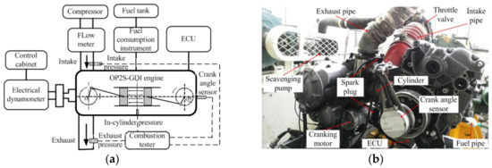 OP2S-GDI engine experiment. (a) Test system; (b) Test bed.