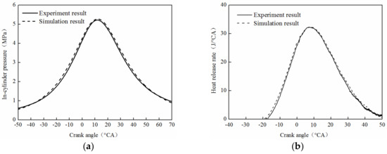 Figure 10 shows the comparison of simulation and experimental results for cylinder pressure and heat release rate. The simulation and experimental results were in good consistency and verified the correctness of working process simulation model equivalent, the scavenging model index, combustion, and heat transfer model. For the simulation result, the whole was greater than the experiment result and its error was less than 5%.
