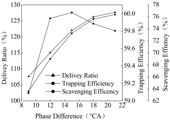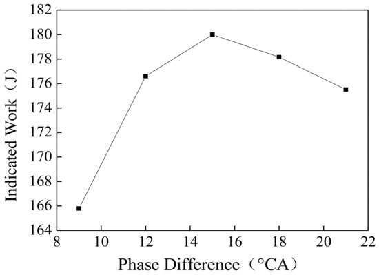 Figure 14 shows with the increase of piston motion phase difference, the cycle-indicated work increases first and then decreases. The indicated work is maximized when phase difference is 15 °CA. With the increase of piston motion phase difference, the in-cylinder scavenging efficiency is increased, but the compression ratio is decreased.