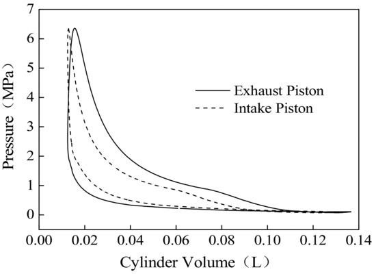 In the case of the same in-cylinder pressure, non-synchronized opposed-piston motion leads to the difference in the optimal burning TDC and heat-power conversion for two pistons. The indicated work of the opposed-piston at 15 °CA piston motion phase difference is shown in Figure 13. Because the exhaust piston motion is earlier than the intake piston motion, the indicated work of the exhaust piston is greater than the intake piston.