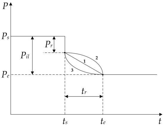 Traditional IL projects are often provided for industrial or commercial users with more than a certain capacity. However, with the development of smart grids, especially smart measurement technologies, small users, such as residential users, have taken a lot of development to participate in demand-side bidding after packaging [37]. As for the diversity of cluster users, they are often in different states when dispatch instructions are issued, making it difficult to cut off all the load agreed at the designated moment. Therefore, such IL protocols need to be set to be more relaxed, enabling users not to cut off all the load immediately [38]. This will lead to the position that the time characteristics of their response are very important for the accuracy of grid operation and dispatching, however there is little relevant literature to study or discuss that. For this type of IL, it is assumed in this paper that its response characteristic is shown as in Figure 1. At time ts, when a dispatch instruction for cutting off Pil of IL is issued, Pr load is cut off immediately, but the remaining load will be gradually cut off within tr period due to the different states that they are in until the all cut off at time te. In the actual situation, some users are sensitive to compensation, and part of their appliances can be turned off at any time. This part of the load will immediately respond to dispatch instructions. Some other users are not sensitive to compensation, or some of the appliances cannot be immediately shut down. This part of the load will respond to the dispatch instructions according to the actual situation. In other words, it takes a process for clustered users to cut off all IL agreed, instead of treating it as a 0, 1 variable in many dispatch models. Because there is no real data to follow, the characteristic of cutting off in tr period is hard to be described accurately. In order to reasonably take the time response characteristics of IL into account, line (curve 1), concave parabola (curve 2) and convex parabola (curve 3) models were constructed as shown in Figure 1, respectively.