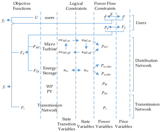 The composition and logical relations of optimization variables, constraints, and the objective functions are shown in Figure 3.