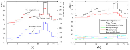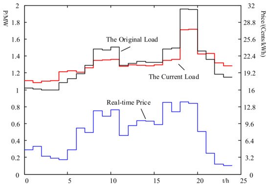 By solving the day-ahead dispatch model, the hourly real-time price and the load response curve (the current load) under the real-time price can be obtained as shown in Figure 5. Under the effect of real-time price, the peak-to-valley difference of load is obviously reduced and the whole load curve is smoother, which can reduce the operation pressure of the grid. Real-time pricing basically presents the characteristic of higher price with heavier load, but the price does not depend entirely on the load level. The price in the current period will affect the load all day and thus change the operation mode and operation cost, which is why the real-time pricing and grid operation mode are optimized together.