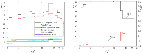 Figure 8a shows that the intra-day moving horizon optimization results have a similar trend with the day-ahead optimization control results. The micro-turbine, storage, and IL will operate in a coordinated way, responding to fluctuations in load and wind power output, resulting in the lowest operating cost of the ADN. In addition, an additional SOC constraint is introduced in the intra-day dispatch so that the optimized SOC result is between 0.8 and 1.2 times the day-ahead SOC result. Figure 8b shows that the inter-day depth of charge and discharge of energy storage is less than the day-ahead result, which is due to the time scale of intra-day optimization. The peak-to-valley difference of load within the optimization time window is smaller, thus the storage tends not to charge or discharge. Taking 0:00–4:00 as an example, the load peak-to-valley difference is very small. If the optimization time window is such, the storage will not charge, resulting in the lack of energy at 18:00–20:00. With the constraint Equation (21) added, the storage has to charge according to the results of the day-ahead optimization to increase the SOC to 0.65, to meet the peak load demand at 18:00–20:00.