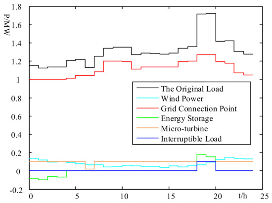 For the results above, the CHP micro-turbine operates in electric load domain mode. To analyze the influence of different operation modes on the results, the thermal load domain mode was simulated and the corresponding power curves are shown in Figure 7. Because the demand and supply situation of the heating load is uncertain, to reflect the demand of the heating load, the heating price is set 50% higher at 0:00–6:00, 21:00–24:00 and 50% lower at 11:00–16:00 than that of the electric load domain mode. From the simulation results, we can see that, under the electric load domain mode, the micro-turbine runs in low power state at 0:00–4:00 when the electric demand is low; under the thermal load domain mode, the micro-turbine runs in high power state almost the whole day except at 6:00–7:00 when the electric demand and heating demand are both low. It shows that the model proposed can adjust the dispatch result for different running modes of the micro-turbine for maximum benefit.
