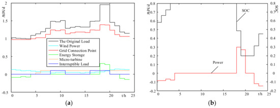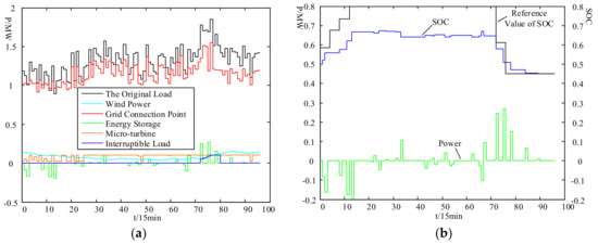 Results of intra-day optimal dispatch: (a) Power curve of each device; (b) State of energy storage.