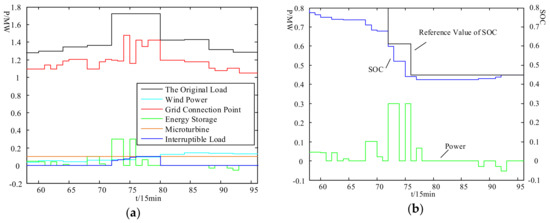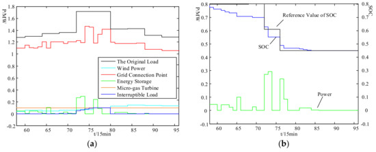 Based on the day-ahead dispatch results, it is possible to keep the data of the case unchanged and carry out the simulation of the intra-day moving horizon optimization. To facilitate the analysis, the linear model is used to analyze the time response characteristic of IL, with an instant response of 0.5 and a response time of 1 h, while the CHP micro-turbine operates in electric load domain mode. The result is shown in Figure 8a. The corresponding state of the storage is shown in Figure 8b, in which the reference value of SOC is the result of the day-ahead model.