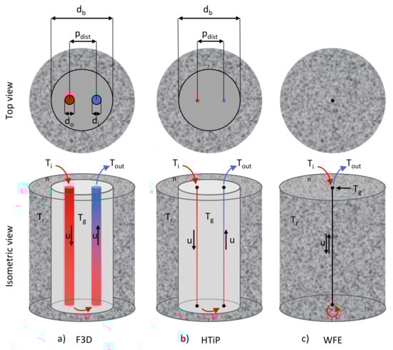 Conceptual drawing of three approaches for the modelling of a borehole heat exchanger (BHE): (a) full 3D (F3D) by Oberdorfer et al. []; (b) Heat Transfer in Pipes (HTiP); and (c) weak form equations (WFE) by Al-Khoury et al. [,].