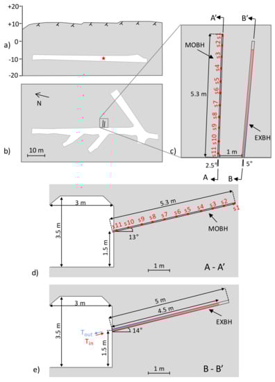 The experiment configuration consisted of two inclined, nearly-parallel boreholes drilled into the wall of the tunnel. The experimental borehole (EXBH) was drilled with a 107 mm diameter, at a height of 1.5 m above the tunnel floor, at an angle of 14° from the horizontal plane and 5° from the vertical plane (see Figure 2e). The monitoring borehole (MOBH) was drilled with a diameter of 47 mm, at a height of 1.5 m above the tunnel floor, at an angle of 13° from the horizontal plane and 2.5° from the vertical plane (see Figure 2d). The drilling was performed with a handheld drill.