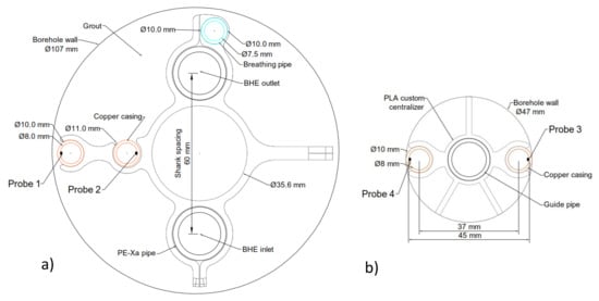 The cross-sectional view of (a) the experimental borehole, EXBH, with the BHE layout; and (b) the monitoring borehole, MOBH.