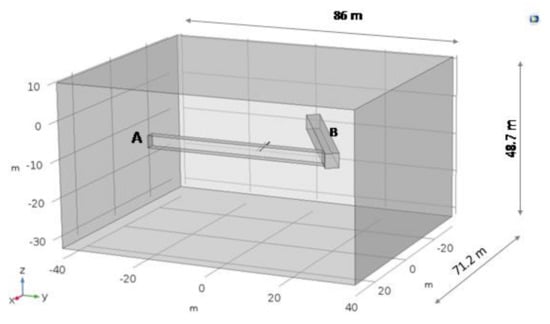 Two rectangular tunnels were included in the model, representing a simplified tunnel network in the vicinity of the experiment site (see Figure 5). The experiment took place in Tunnel A, and its dimensions are given in Figure 2d. To simulate the effect of the tunnel’s air temperature on the temperature of the rock mass, Tunnel B was included in the simulation (see more details in the section on pre-heating steps). The angle between the tunnels was equal to 56°. Additionally, tunnel B dipped upwards at an angle of 7°.