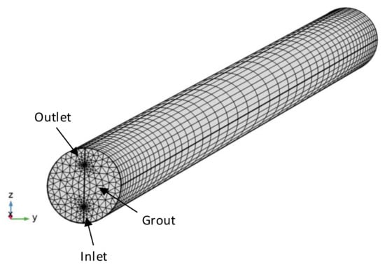 Other simplified numerical approaches were presented by Ozudogru et al. [] and Holzbecher and Rauschel [] with the U-tube pipes being also represented as 1D elements, but with a slightly modified approach. The former introduced the so-called pseudo-pipes to overcome the absence in the pipe’s heat capacity, and the latter presented a method to discretise the pipes using the extruded linear element to simplify the geometry and limit the number of elements.