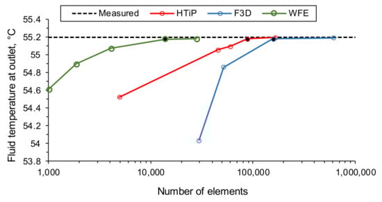 A mesh sensitivity study is required to find the degree of mesh convergence so that global or local mesh refinement does not change results significantly, (i.e., the discretisation error is minimised) []. The mesh was optimised so that it accomplished mesh convergence but was not finer than required so that the computational expense is kept as low as possible. The number of elements was increased and the outlet fluid temperature was measured after 21 days of heating. The results of the mesh sensitivity for each modelling approach are presented in Figure 7. It can be seen that by increasing the number of elements, the fluid temperature at the outlet also increased until reaching a stable point; this was the optimal mesh size and was selected for further analysis.